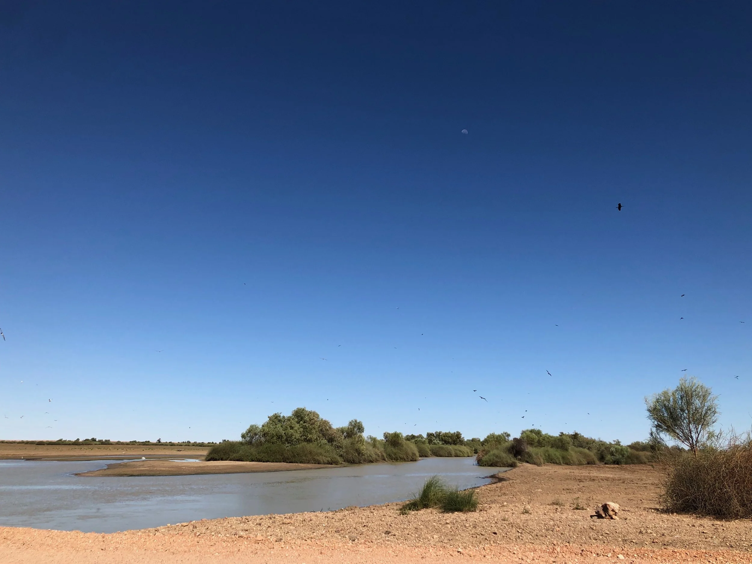 Lazy day today. Car to repack and work out the trip for tomorrow. Lunch at the Birdsville Bakery and another great coffee don’t know when will be our next one. Went out to Pelican point after lunch and after the recent rains the water is rather muddy. No Pelicans about but did spend some time watching the kestrels trying to find fish in the muddy Billabong.